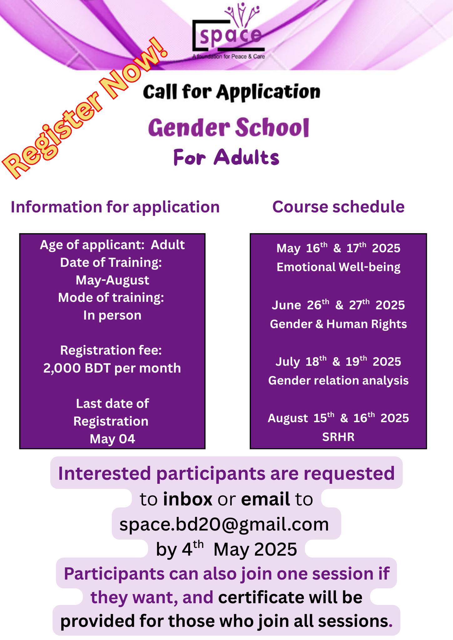 Registration Fee: 2,000 BDT per month Training Mode: In-person (face-to-face) Apply by: May 04, 2025 Email: space.bd20@gmail.com