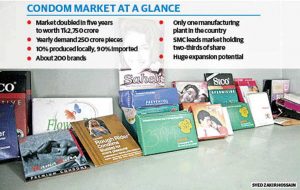 “We float tenders and buy condoms from renowned international manufacturers with our brand names,” said Khandaker Shamim Rahman, head of marketing, SMC Enterprise Ltd, which holds two-thirds of the condom market share.