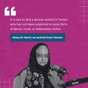 “It is rare to find a woman activist who has not been subjected to some form of abuse, insult, or defamation online, ” said Afraa Al-Hariri, an activist from Yemen.